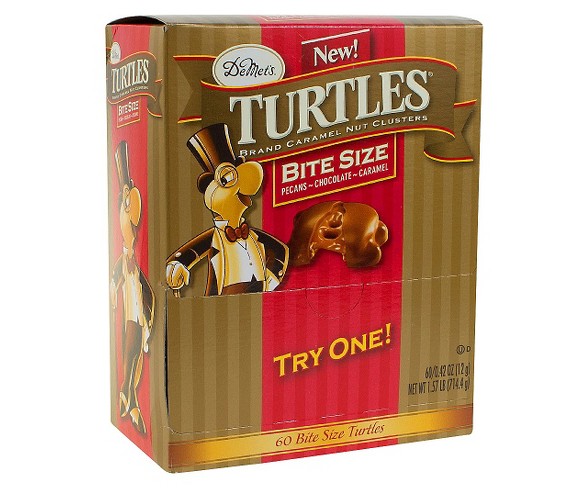 Description DeMet's Turtles Original Bite Size 0.42 oz.: 60 CountDeMet's original Milk Chocolate, caramel, and pecan Turtles now in miniature! The individually wrapped 0.42 oz. bite-sized Turtles are perfect for single-serve snacking, grab-and-go lunches, and a classic glass candy dish.Kosher Certified OUContains: Soy, pecans, MilkMay Contain: Milk, tree nuts, soyStore: In a Dry location at Room temperatureDietary Needs: KosherForm: PiecesState of Readiness: Ready to eatChocolate type 1: Milk chocolatePackage type: Individual item multi-servingNet weight: 1.57 poundsExterior container material: Paper or cardboard Estimated shipping dimensions: 6.0INCH X 12.0INCH X 8.0INCH DPCI : 055-02-0561 UPC : 872181005767 TCIN : 17099937 Estimated shippimg weight: 2.2POUND