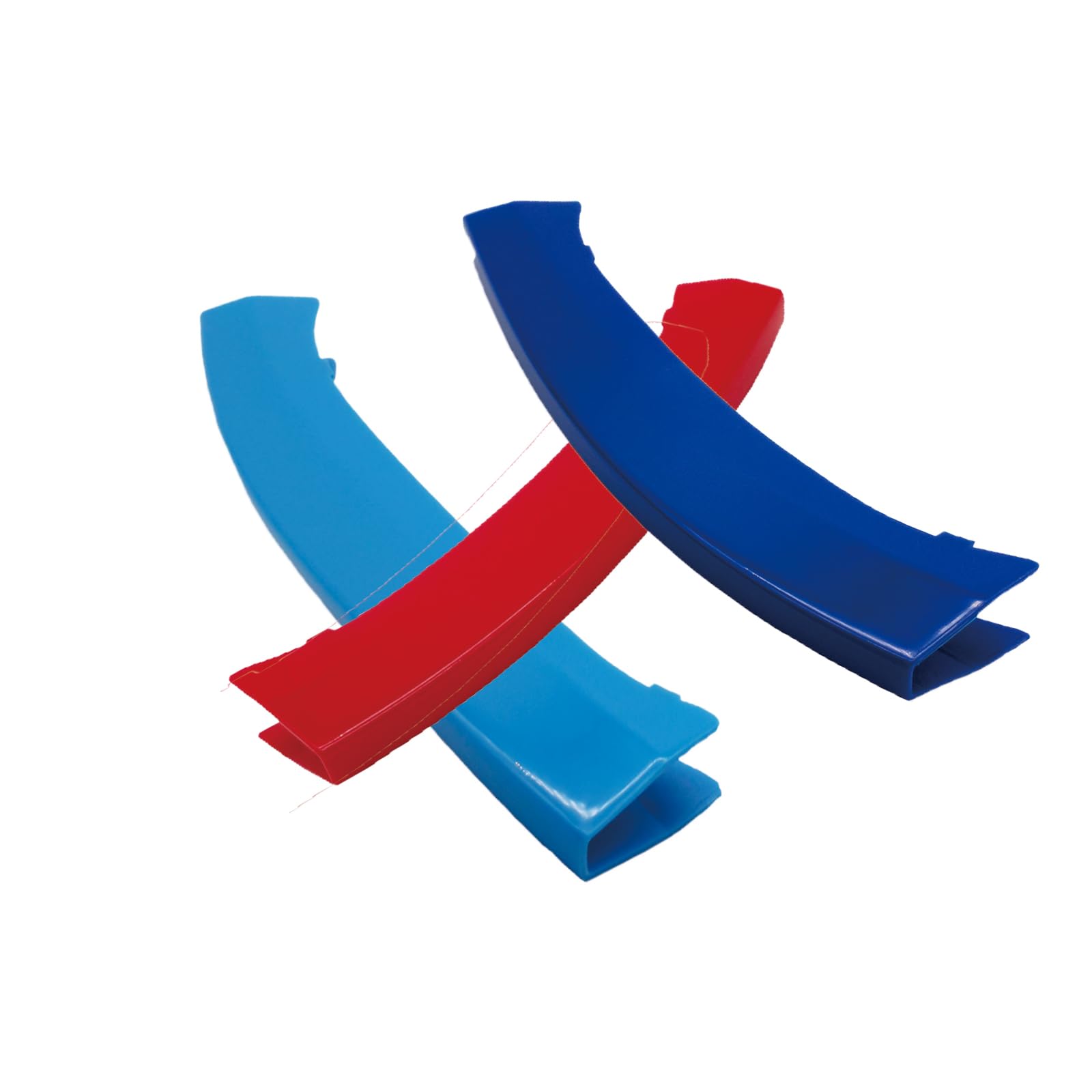 The Three Colored Stripe Grille Insert Trims are designed for BMW F25 X3 (2011-2017) and F26 X4 (2014-2018) models. Made from durable ABS plastic, these trims offer a stylish upgrade with easy installation. The vibrant red, dark blue, and light blue colors enhance your vehicle's appearance while ensuring a perfect fit.